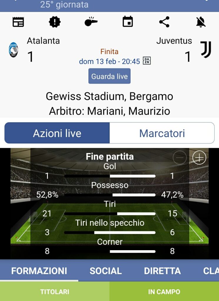 Tuttavia anche la Juventus ha cercato di attaccare, ma la sfortuna o semplicemente una serata storta ha rimediato un pareggio.